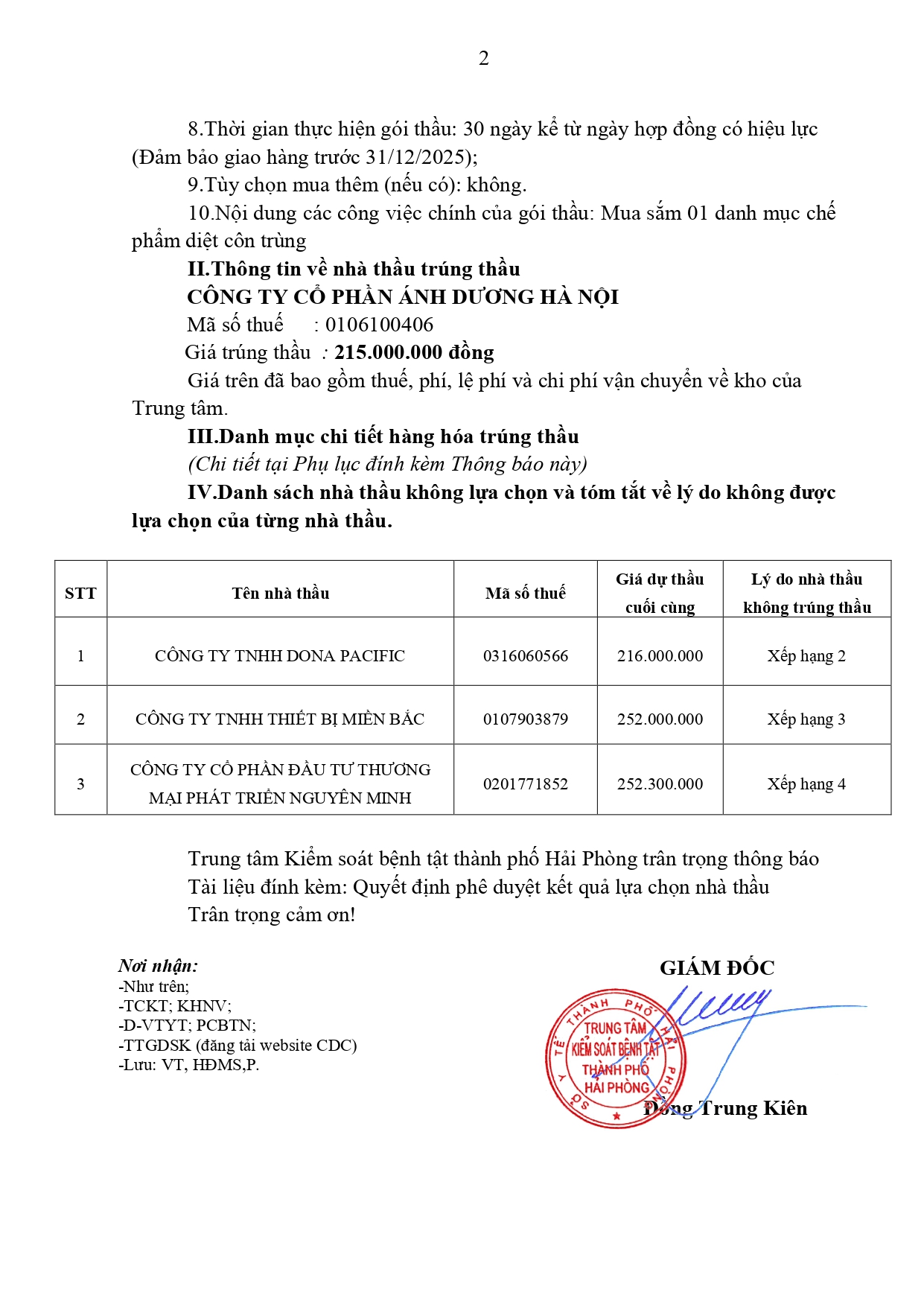 14 KQ lựa chọn nhà thầu "Mua sắm chế phẩm diệt Côn trùng Pc dịch SXH Dengue từ nguồn ngân sách nhà cước của TT Kiểm soát bệnh tật thành phố HP"