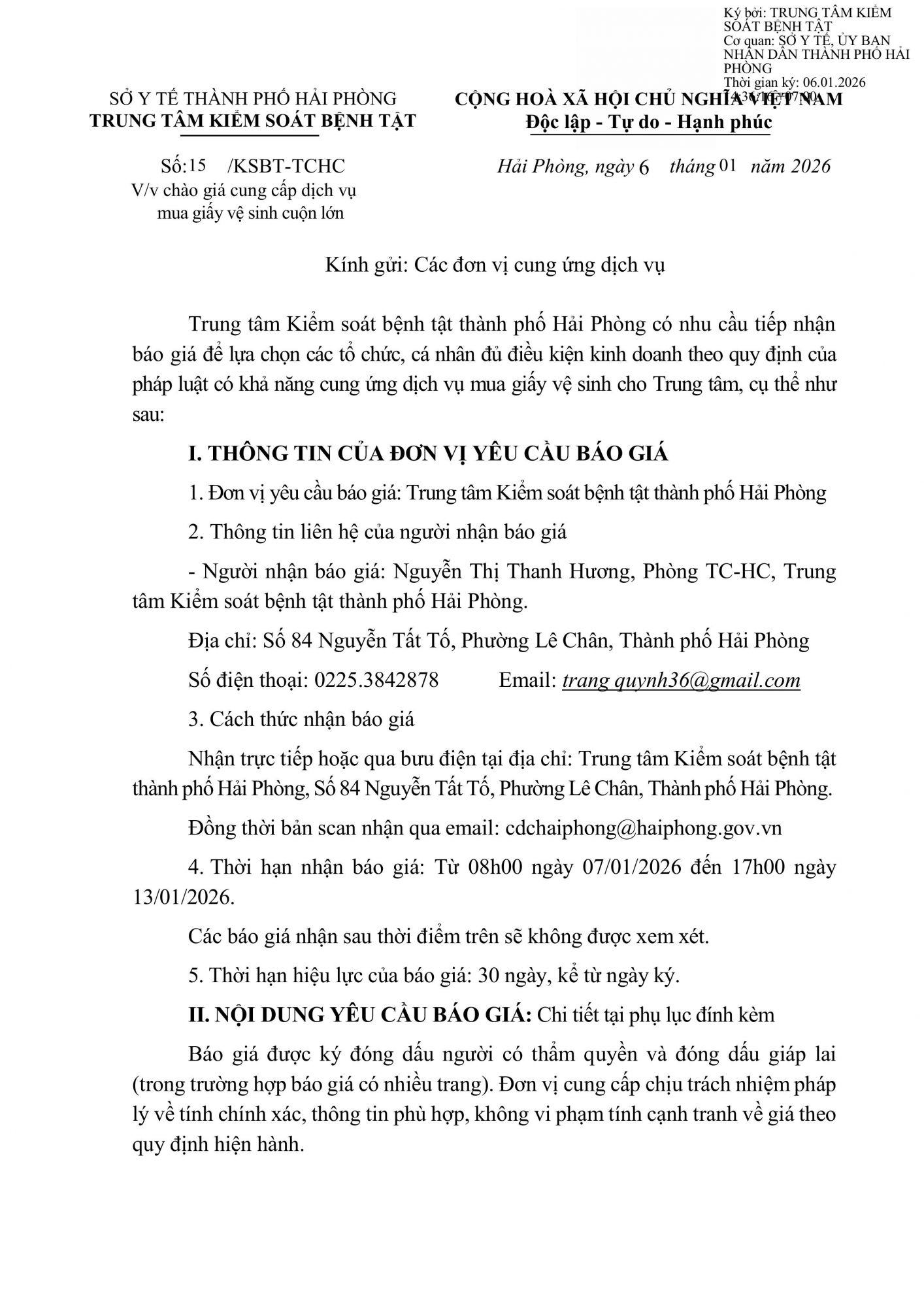 Thứ 3, 06/01/2026 | 15:13 A- A A+ | 15 Công văn chào giá cung cấp dịch vụ mua giấy vệ sinh cuộn lớn Cv_chao_gia_mua_giay_cuon_lon_signed_7c62c0fc0c.pdf Đọc bài Lưu Tập tin đính kèm Tổng số điểm của bài viết là: 0 trong 0 đánh giá Click để đánh giá bài viết