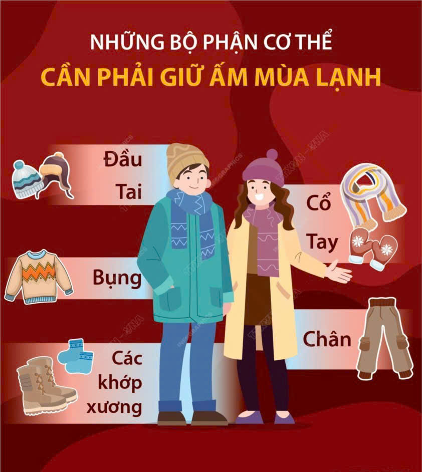Trước hết, giữ ấm cơ thể là yếu tố then chốt trong việc phòng chống các bệnh do lạnh gây ra. Khi cơ thể bị nhiễm lạnh, sức đề kháng sẽ suy giảm, tạo điều kiện cho bệnh tật xâm nhập. Vì vậy, mỗi người cần chú ý mặc đủ ấm khi ra ngoài, đặc biệt là giữ ấm các bộ phận quan trọng như đầu, cổ, ngực, bàn tay và bàn chân. Việc đội mũ, quàng khăn, đeo găng tay và đi tất ấm tuy đơn giản nhưng có tác dụng rất lớn trong việc hạn chế mất nhiệt cơ thể.