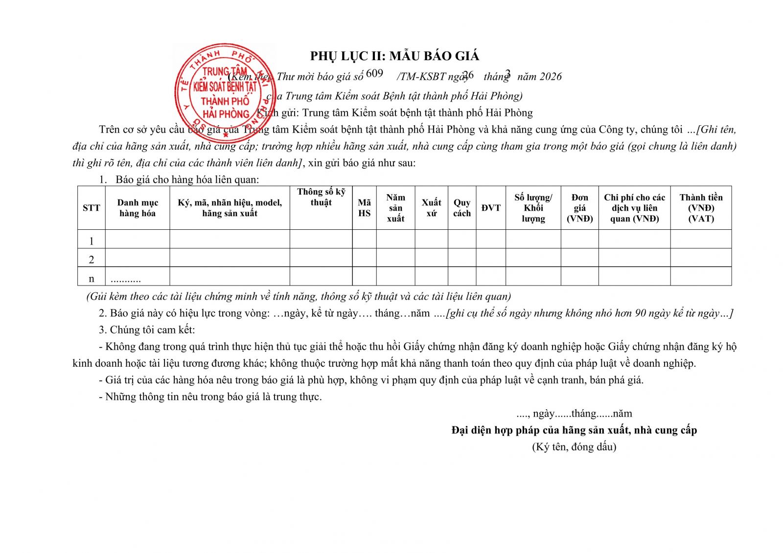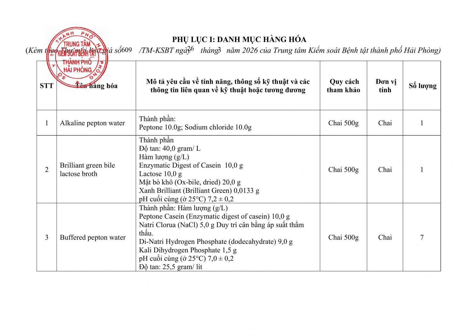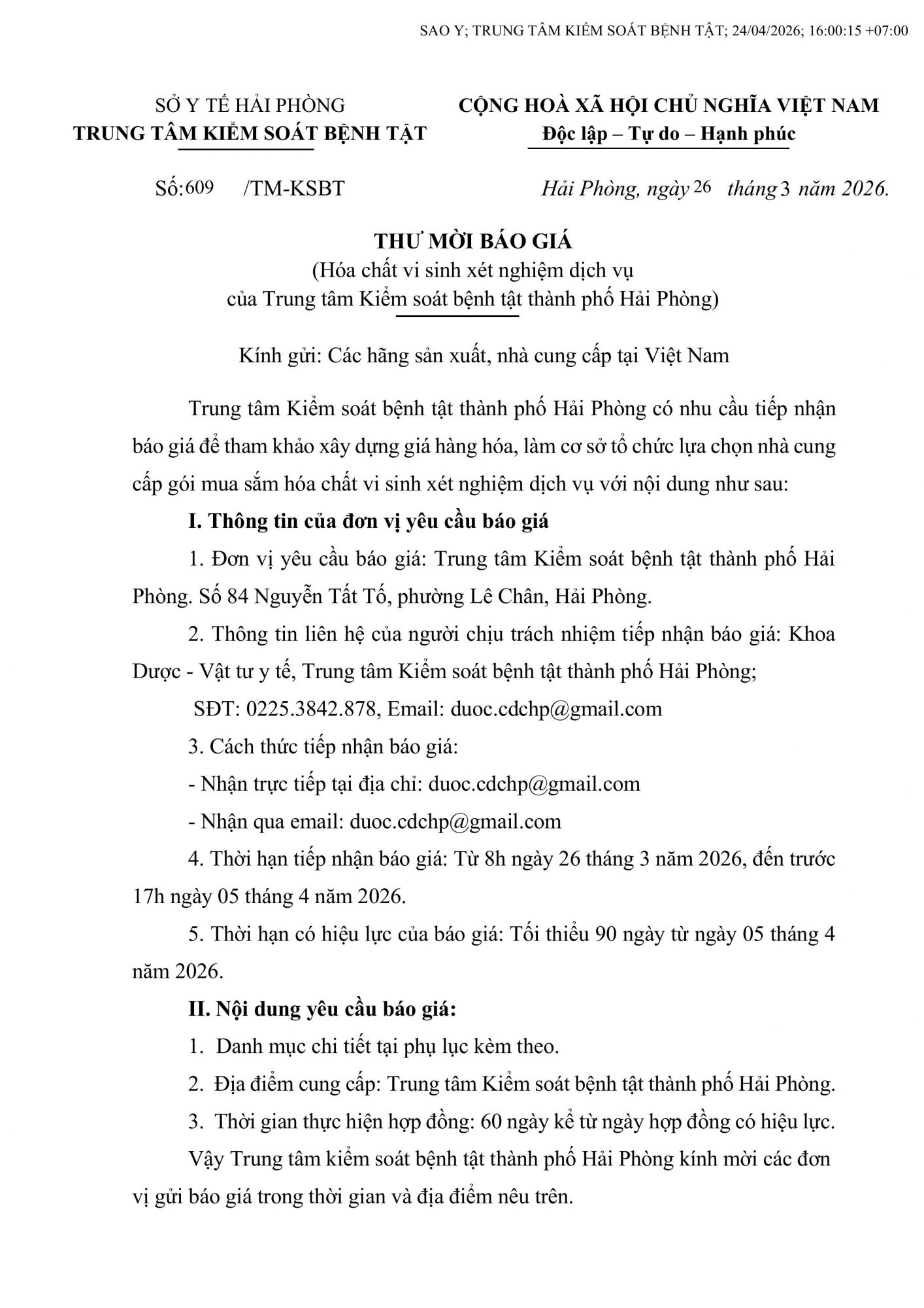 Thứ 5, 26/03/2026 | 07:32 A- A A+ | 609 Thư mời báo giá Hóa chất vi sinh xét nhiệm dich vụ 2__thu_moi_bao_gia_signed_2a7084932b.pdf Đọc bài Lưu Tập tin đính kèm Tổng số điểm của bài viết là: 0 trong 0 đánh giá Click để đánh giá bài viết
