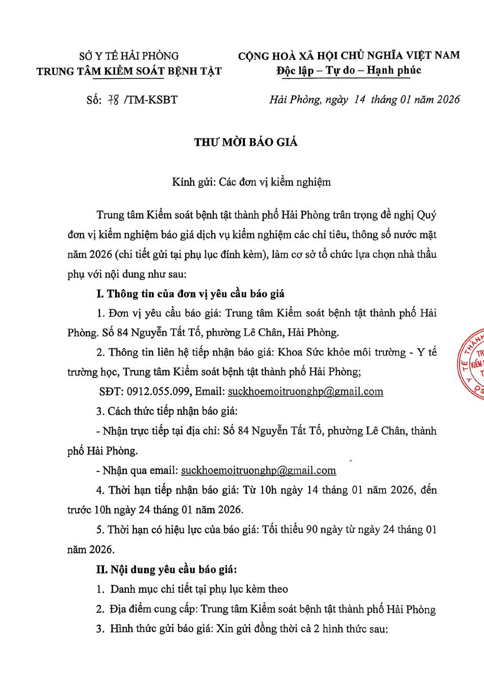 Thứ 4, 14/01/2026 | 10:52 A- A A+ | 78 TM-KSBT Thư mời báo giá dịch vụ kiểm nghiệm 78TM-KSBT_1_44300b190b.pdf Tập tin đính kèm Xem Đọc bài Lưu Tập tin đính kèm Tập tin đính kèm Tổng số điểm của bài viết là: 0 trong 0 đánh giá Click để đánh giá bài viết